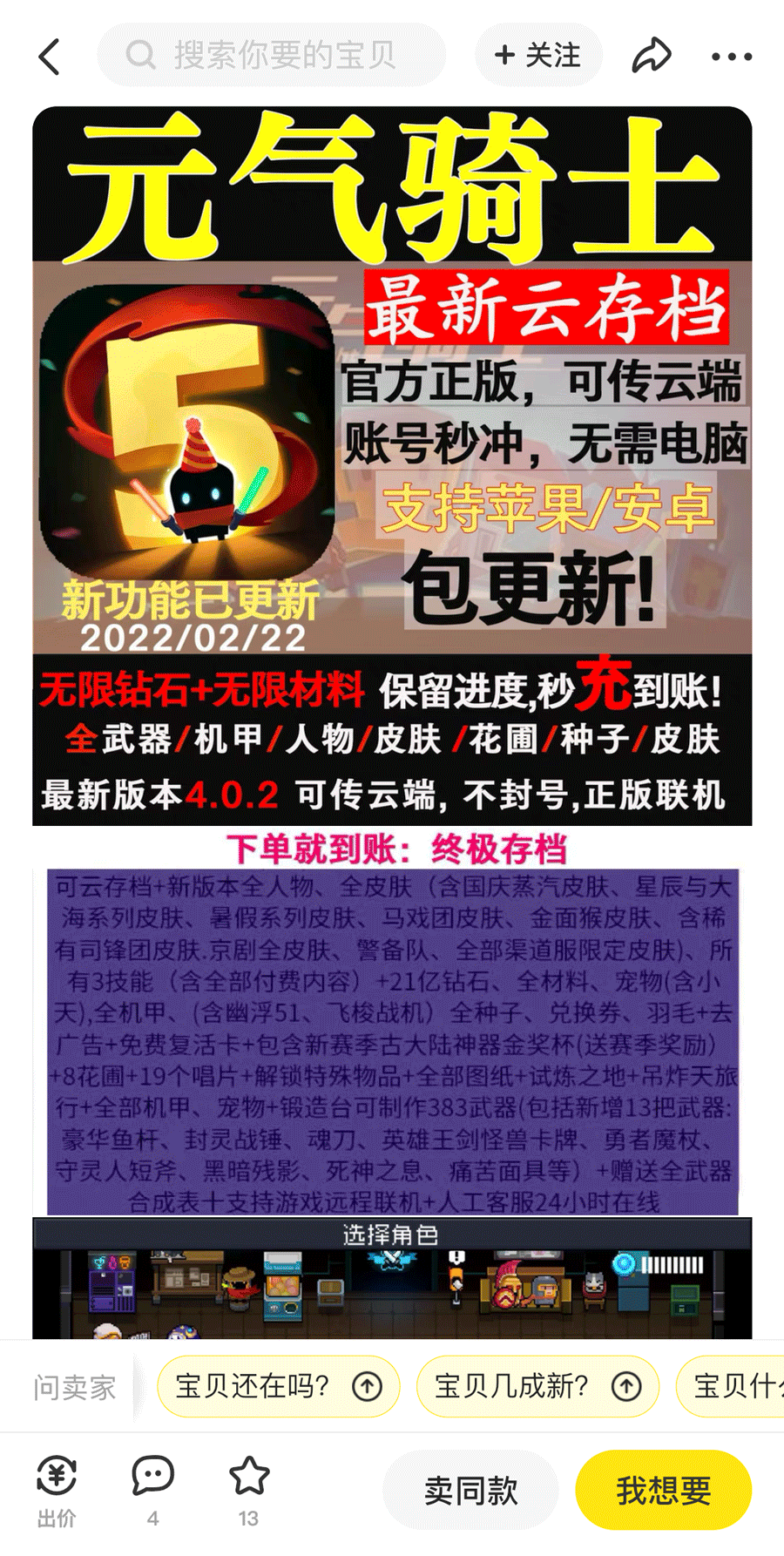 这类“存档”也是打着类似无限资源、极品装备、一刀999的噱头,以极低的价格吸引着玩家,只需要投入少量成本就能一跃成为游戏中的“高玩”,一些人气游戏的存档甚至销售量已达上千。